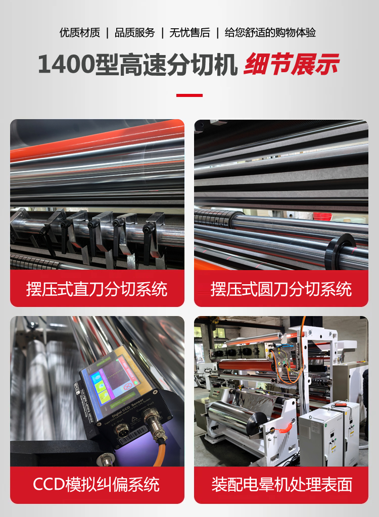 为福建客户定制的1400D4-2型电脑控制高速华体会网页版页面登录-华体会(中国) ,宽幅1400mm,分切速度350m/min,采用CCD模拟纠偏系统,配备摆压式直刀和圆刀分切系统,分切多种规格,按要求配置电晕机,速度150m/min。分切12u-50um卷筒类镭射膜、镀铝膜、冷烫膜、电化品等塑料薄膜